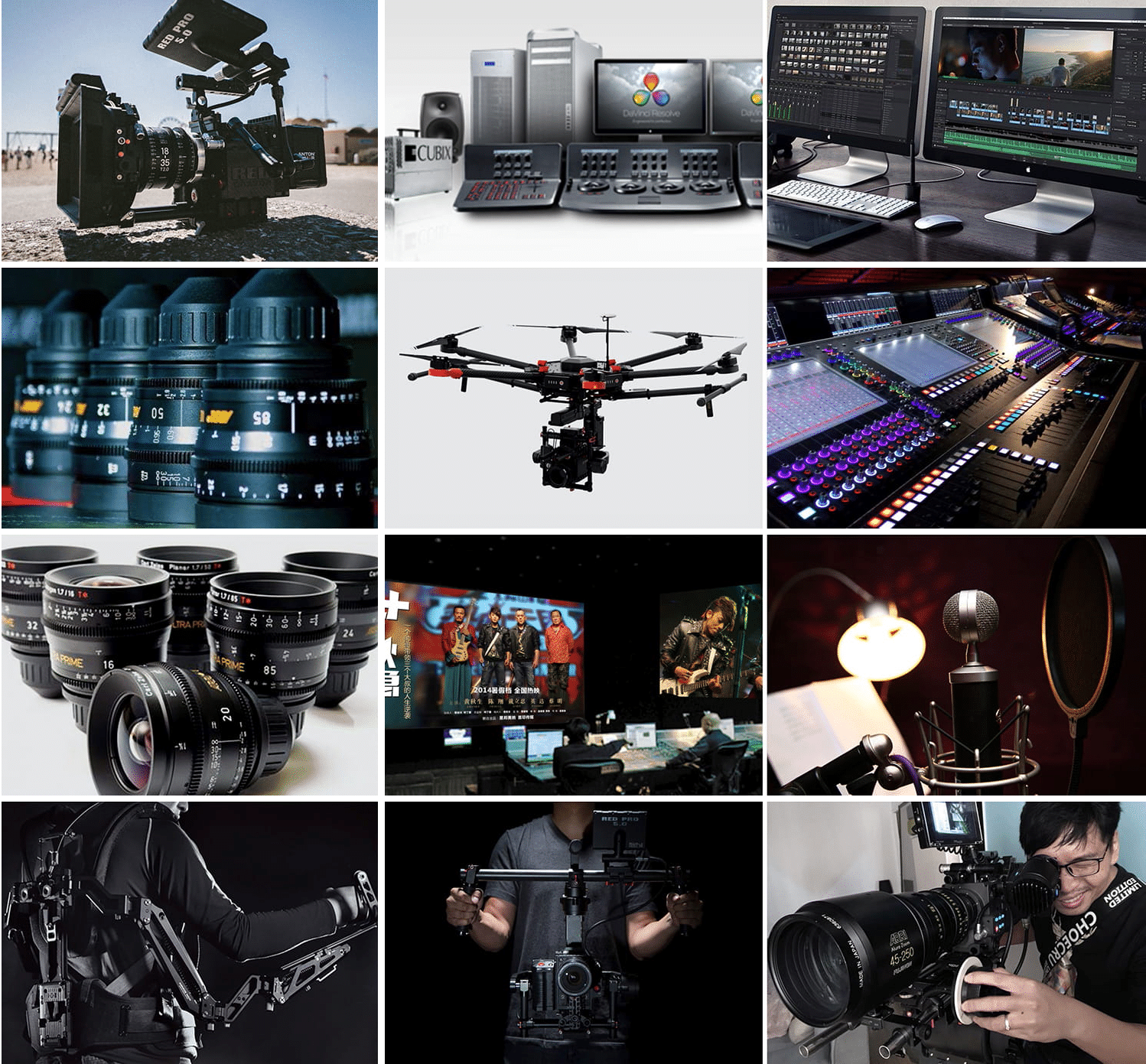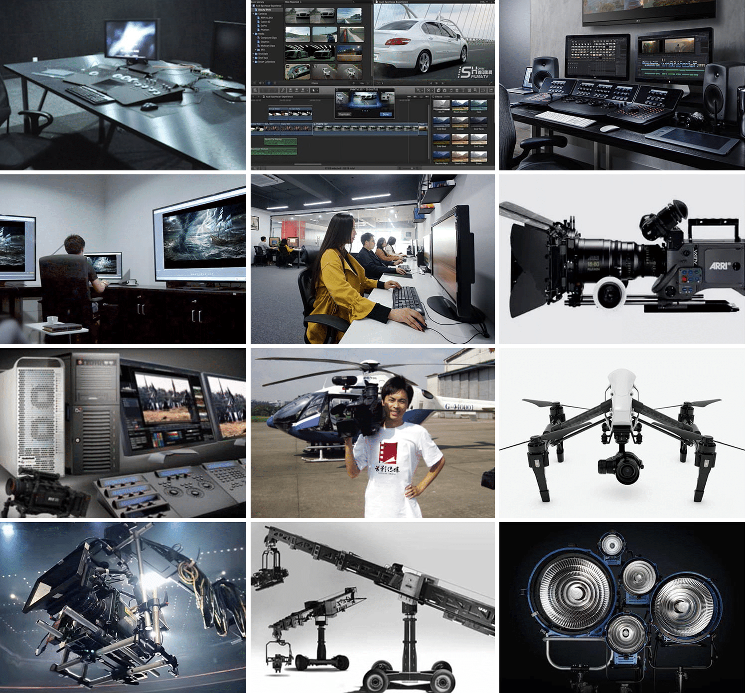 集團旗下各子公司都分別購置了電影數(shù)碼攝影機、航拍無人機、蘋果4K剪輯系統(tǒng)、動畫制作系統(tǒng)、特效包裝系統(tǒng)、阿萊燈光、軌道、搖臂等全套高端制作設備,為創(chuàng)意方案的完美執(zhí)行提供了有力支撐,也有效降低了客戶影片的制作成本。
